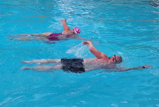Friendly, relaxed swim session with no lane ropes, suitable for swimming lengths or widths, exercising in water or simply catching up with old friends by the pool.